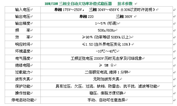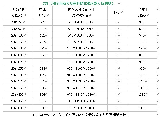 DBW單相/SBW三相全自動大功率補償式電力穩(wěn)壓電源,是本公司引進吸收西歐先進技術,同時結合我國電網(wǎng)狀況為穩(wěn)定交流電壓精心設計而成。當外界供電網(wǎng)絡電壓波動或者負載變化時,電壓采樣電路能夠采集輸出電壓變化,經(jīng)自動控制電路比較、放大,驅動電機正反或反轉。實現(xiàn)輸出電壓的恒定,確保用電設備正常運行。它由接觸調壓器、補償變壓器、自動控制電路和伺服電機、航空套等組成。本產(chǎn)品與其他型號穩(wěn)壓電源相比是有輸出功率強、效率高、無波形畸變、保護功能強、運行可靠、維護方便、適應任何負載、能承受瞬時超載、可長期連續(xù)運行等優(yōu)點。